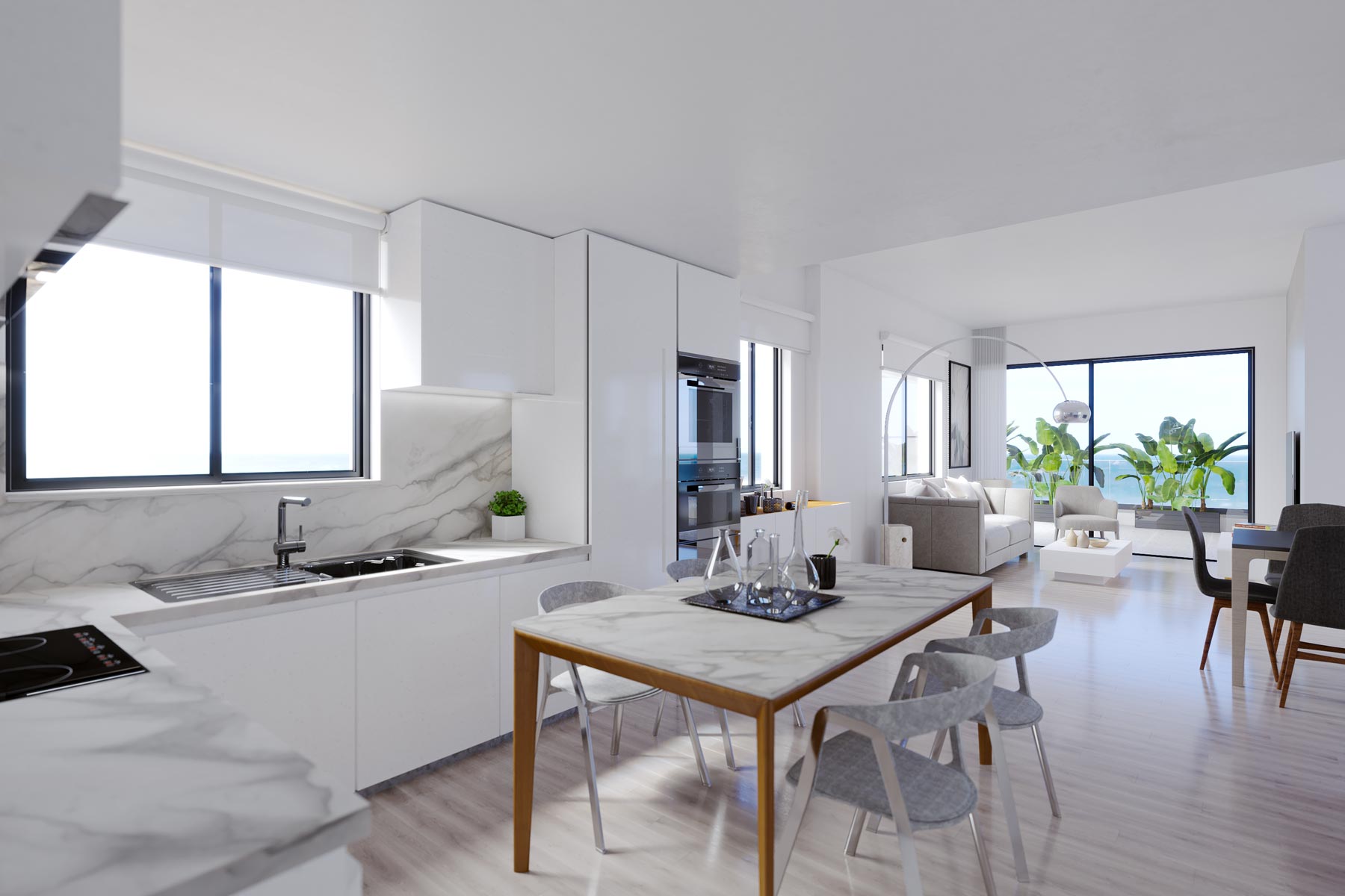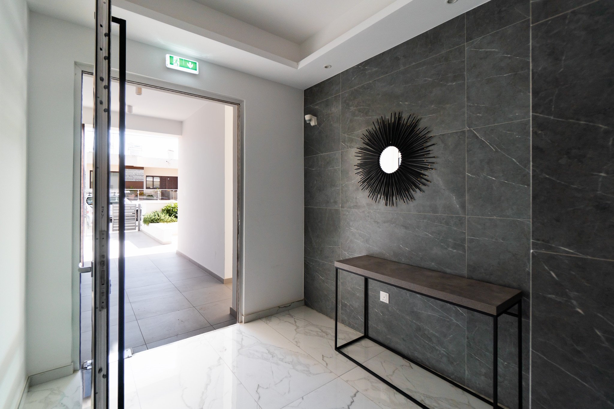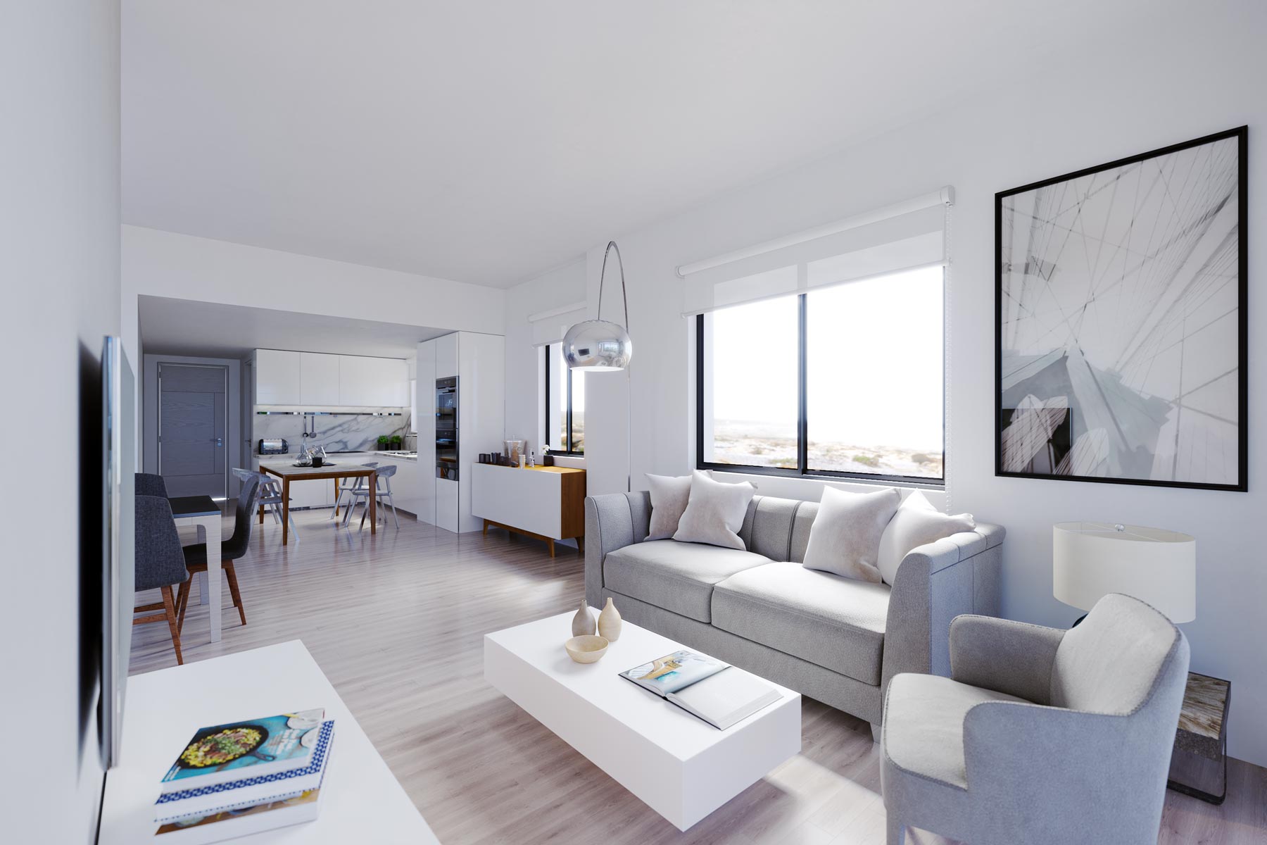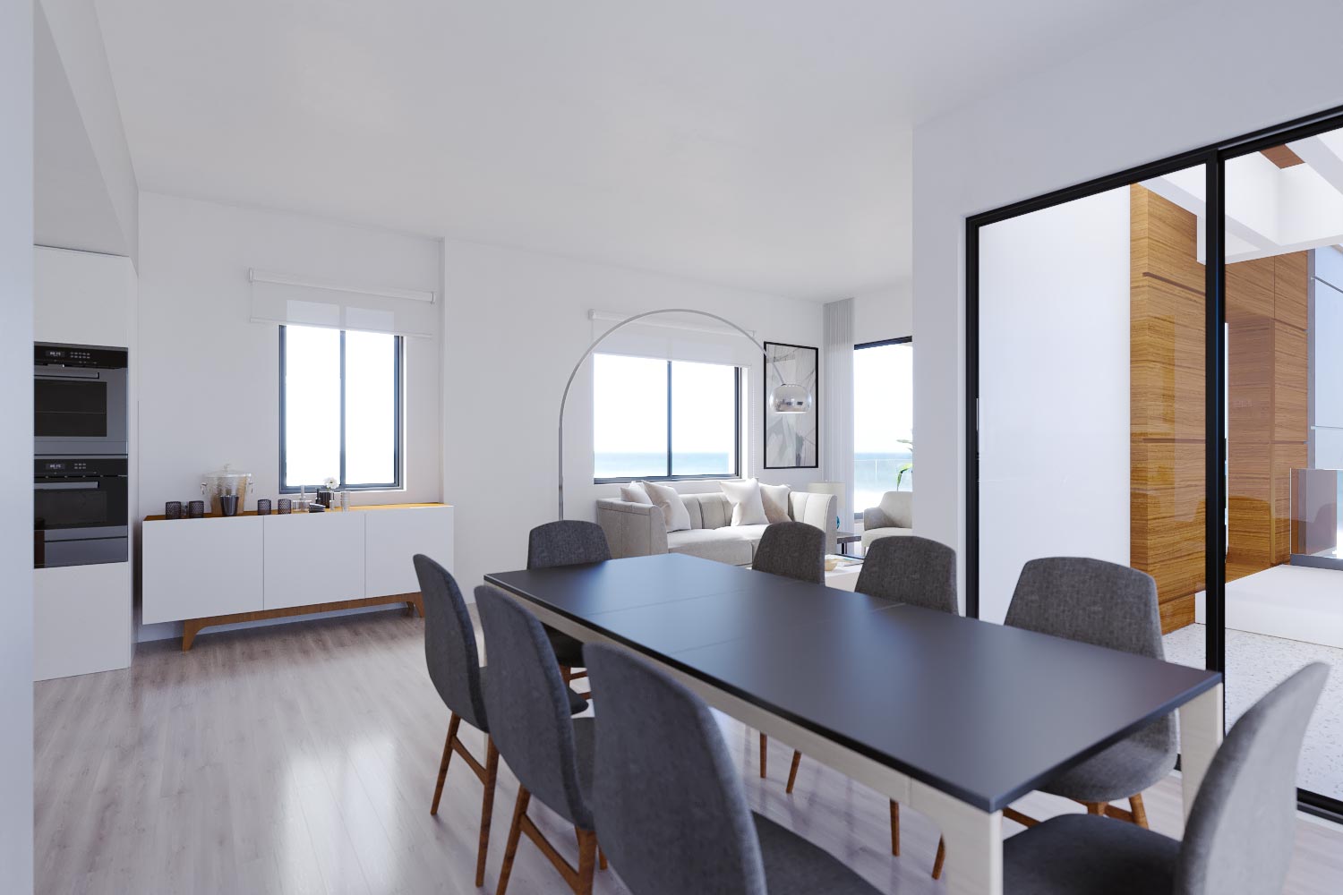 Η σύγχρονη αρχιτεκτονική του αποπνέει ζεστασιά, με την κομψή όψη του σε λευκές και σκούρες γκρι αποχρώσεις να δημιουργεί μια μοναδική γεωμετρική σύνθεση, που ενισχύεται από ξύλινα στοιχεία και μεγάλες, φωτεινές βεράντες με γυάλινα κιγκλιδώματα.