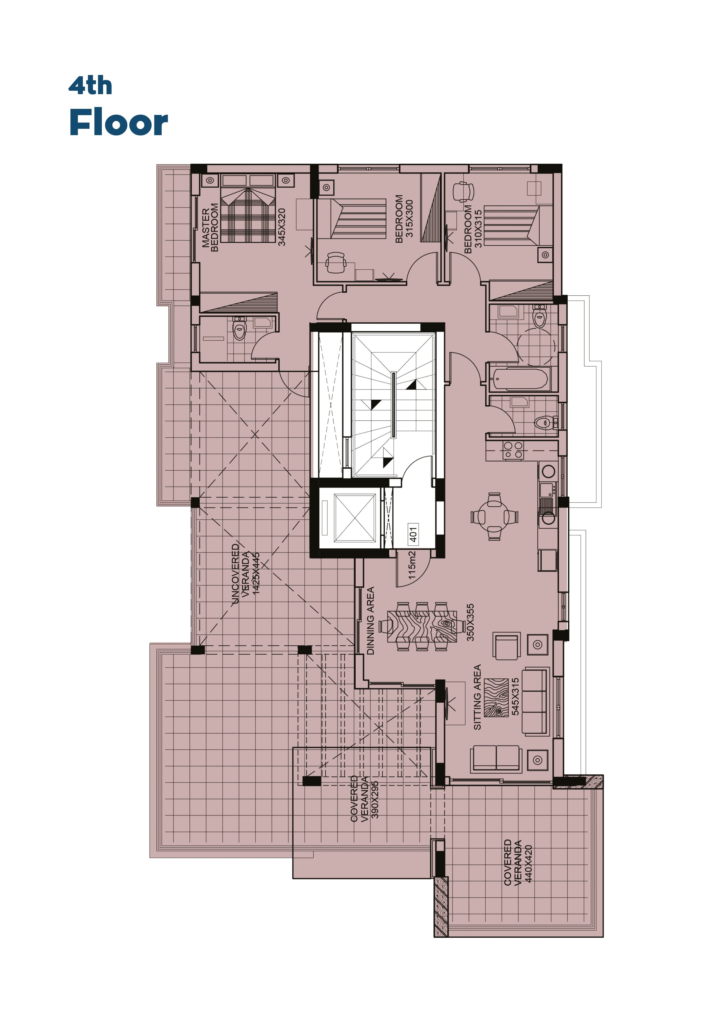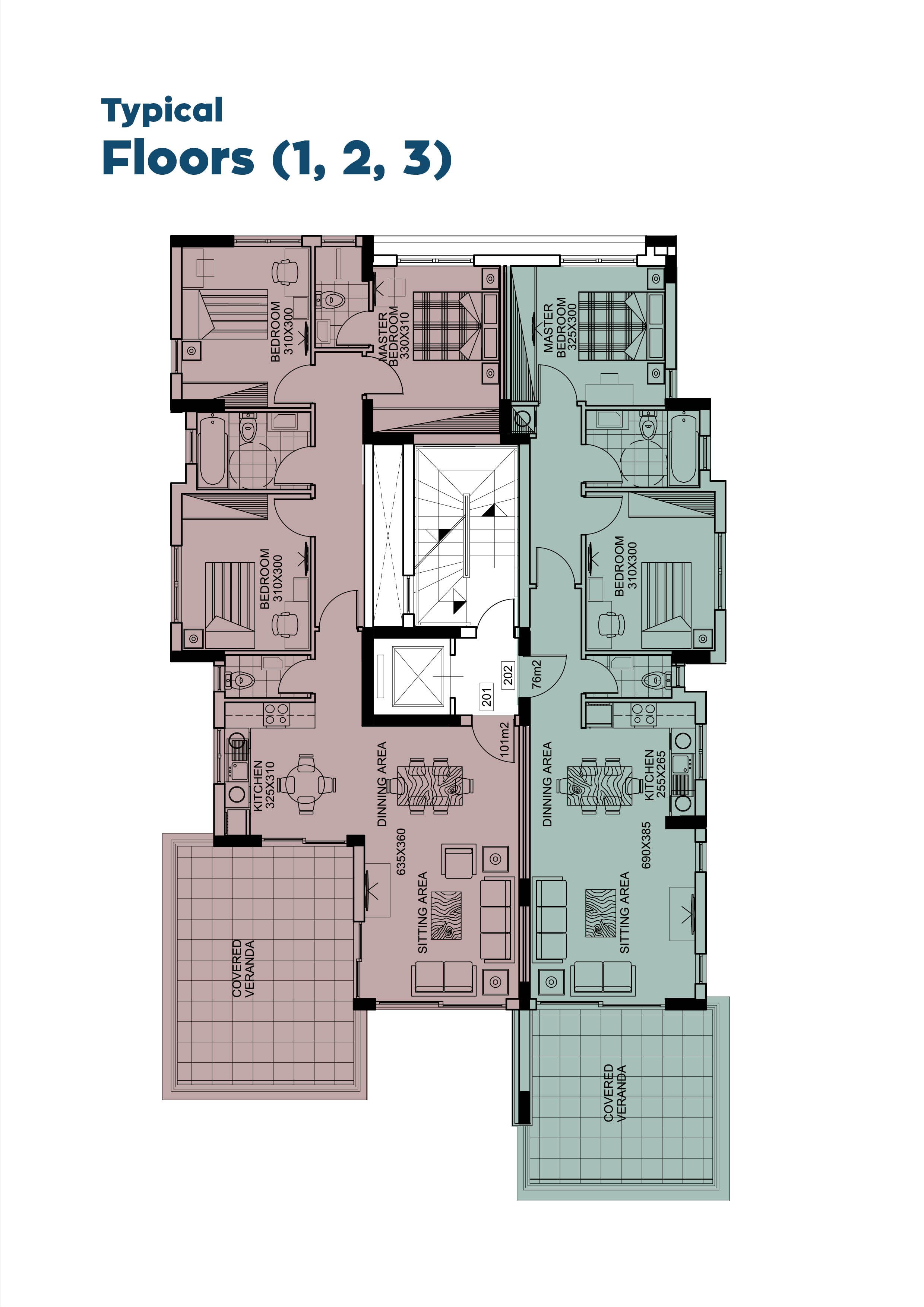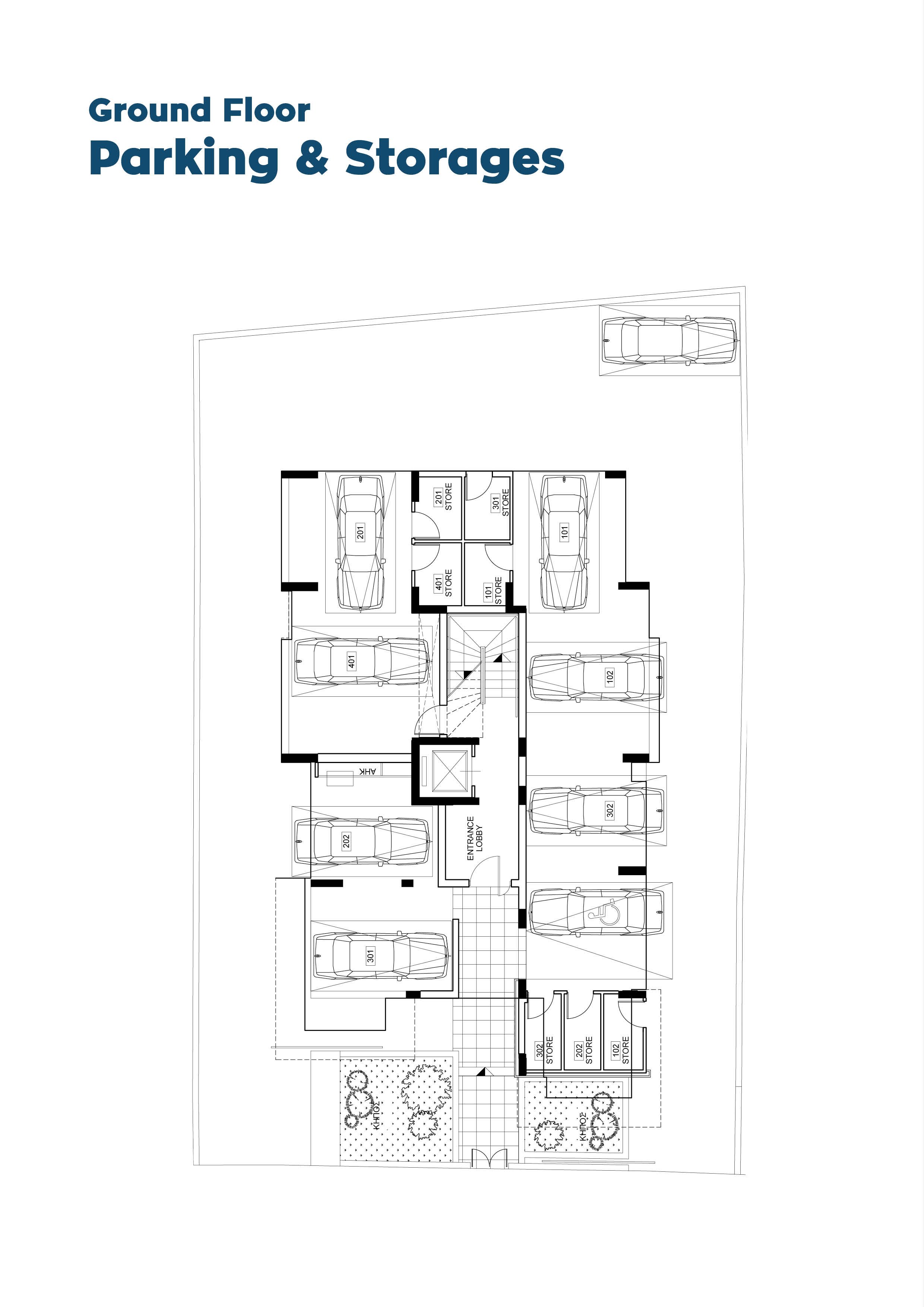 Τα 7 διαμερίσματα είναι ομοιόμορφα κατανεμημένα στους τέσσερις ορόφους, με ένα διαμέρισμα τριών υπνοδωματίων και ένα διαμέρισμα δύο υπνοδωματίων σε κάθε όροφο, καθώς και ένα ευρύχωρο ρετιρέ τριών υπνοδωματίων στον τέταρτο όροφο. Κάθε διαμέρισμα τριών υπνοδωματίων διαθέτει δικό του κύριο υπνοδωμάτιο. Όλα τα διαμερίσματα περιλαμβάνουν καλυμμένο χώρο στάθμευσης και αποθήκη.