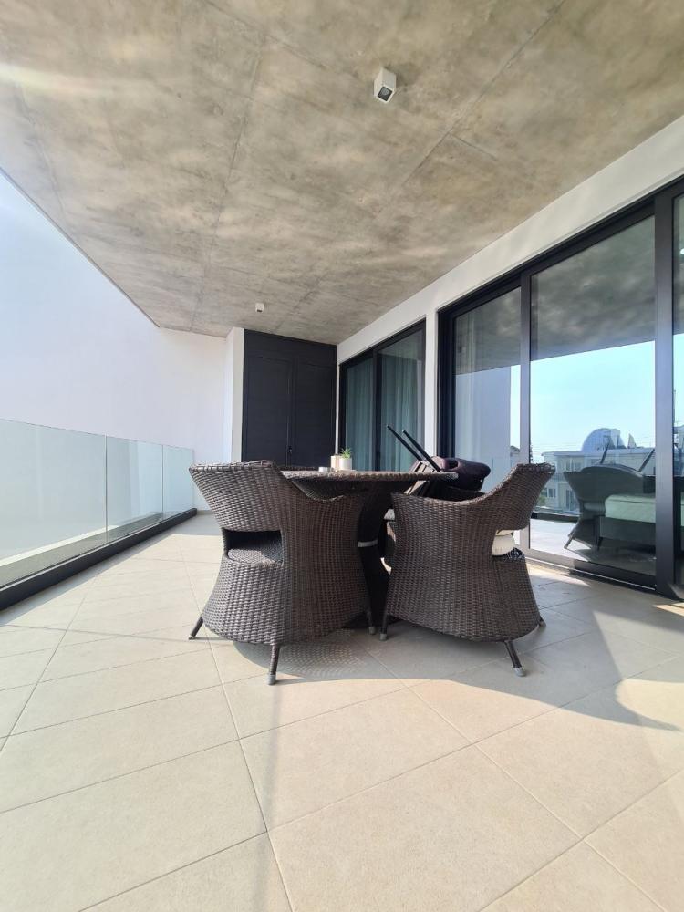 Limas Residences comprises a total of 13 apartments of varying sizes. Residents will enjoy being a stone’s throw from some of Limassol’s famed Blue Flag Beaches, as well as having all nearby amenities within very easy reach. Public and private schools, supermarkets, vibrant nightlife, upscale shops and high-end cafés and restaurants are all a short drive away. Limas Residences is an imposing, four floor development featuring stylish, contemporary architecture that emphasizes sharp angles and geometric shapes. With a glass and concrete façade in shades of dark grey, complemented by stark white walls and dark wood louvers, the building exudes an aura of majesty and luxury. Each of the 13 apartments are evenly spaced out across four floors, with four two bedroom apartments on the first to the third floor and one three bedroom apartment on the fourth floor. In this way, Limas Residences creates a sense of community and neighborliness among its residents, while also allowing a sense of privacy and security, as well as the added benefit of a generously spaced out home. Limas Residences boast luscious, landscaped gardens complete with a secluded, outdoor swimming pool and deck area, where residents and their families can kick back and relax in the privacy of their own home. Each apartment includes one parking space as well as a storage room on the ground floor. As night falls, the exterior of the building is warmly lit up with strategically placed spotlights. This, combined with the secure fencing, creates an environment that does not compromise on privacy, safety or comfort.